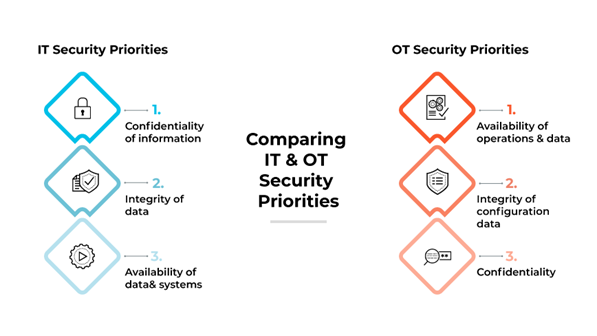 Traditionally, IT security focuses on protecting data and maintaining the confidentiality, integrity, and availability of information. OT security is more concerned with ensuring the availability, integrity, and reliability of industrial processes in addition to the safety of human lives and the environment.